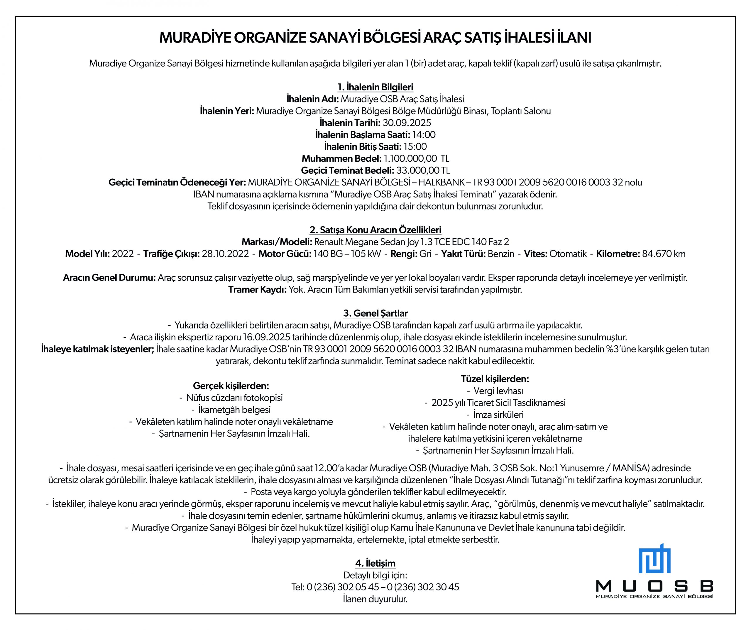 MURADİYE ORGANİZE SANAYİ BÖLGESİ ARAÇ SATIŞ İHALESİ İLANI
